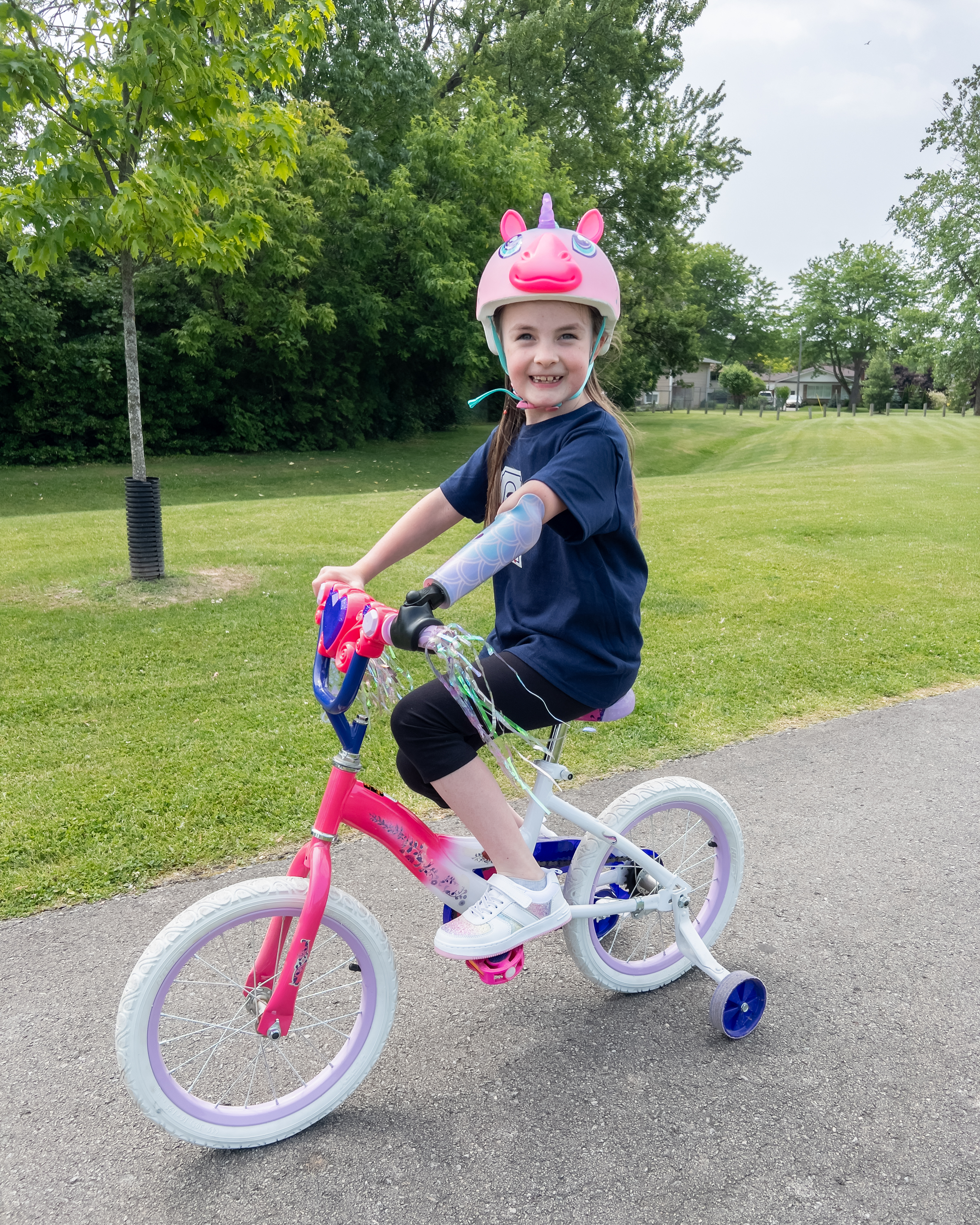 “When she walks into a room, her amputation often makes her different from everybody else, so being able to meet kids just like her at CHAMP seminars is very special,” say Shannon and Josh. “Thanks to The War Amps, Kenzie has the artificial limbs and devices she needs for the hobbies she loves. She has a bike device that attaches to her artificial arm and allows her to keep a safe grip on the handlebar while riding. She also has a tumbler device that fits onto her artificial arm to help with balance and floor exercises during karate.”