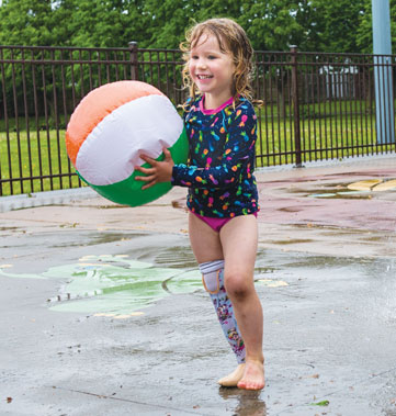 A young female with a Syme’s amputation holds a beach ball while playing in the water at a splash pad.